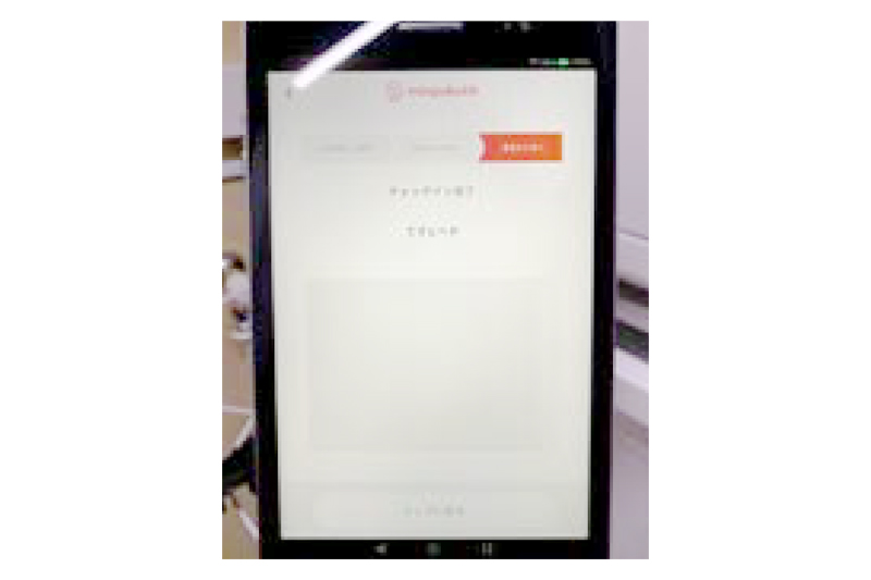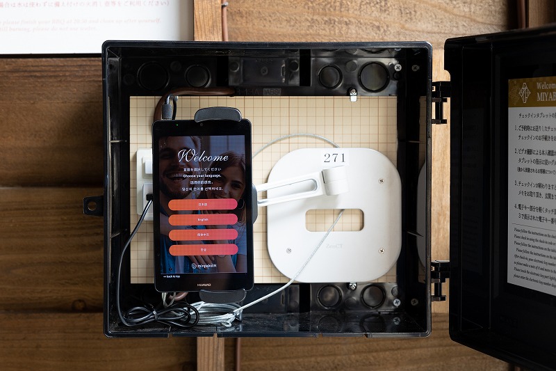 ボックス内のタブレット端末にてお手続きをお願いいたします。画面の指示に従い、事前にお送りした「チェックインコード」をご入力ください。