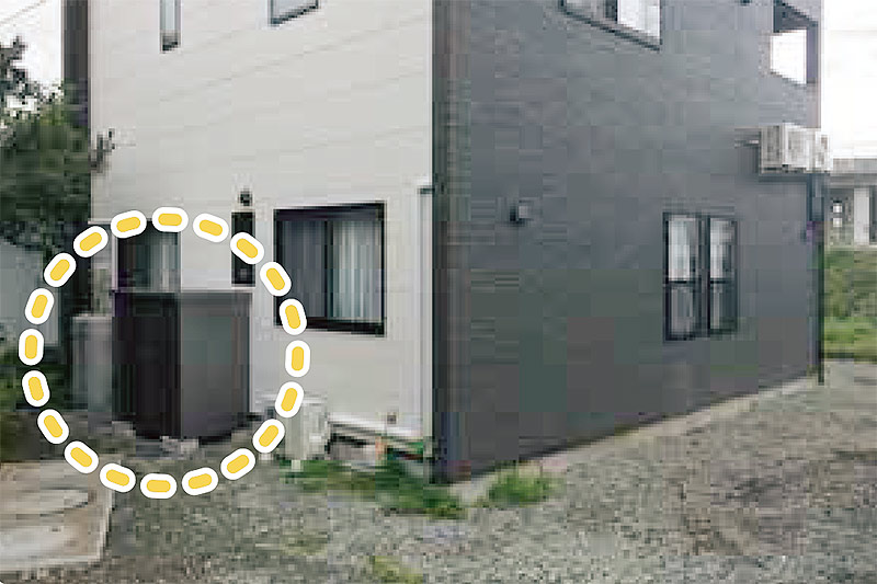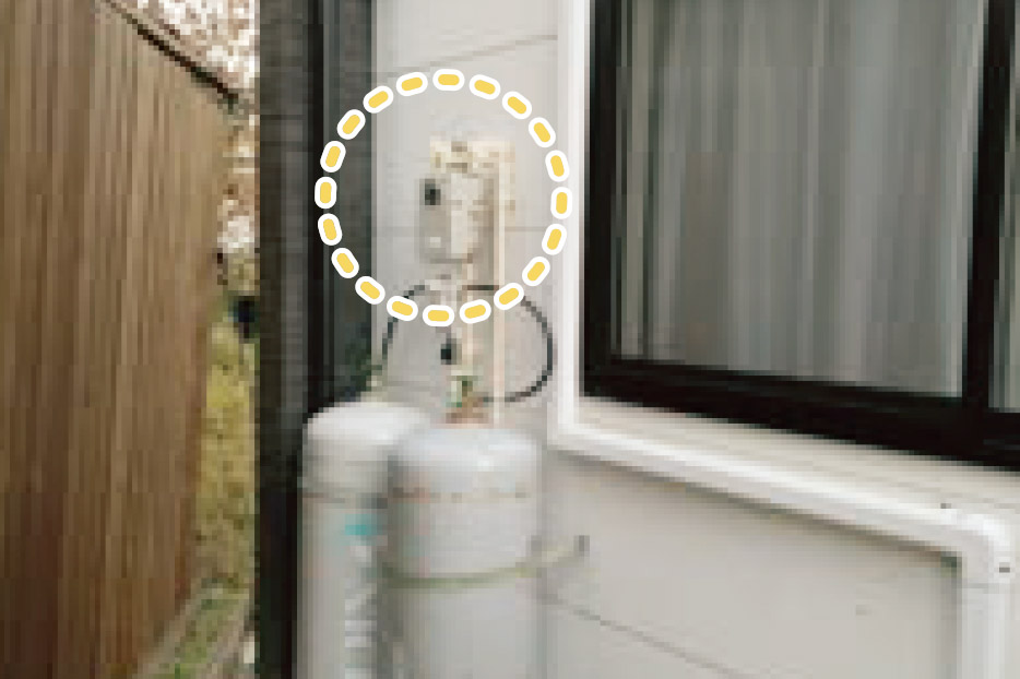 - 玄関を出て建物の裏側へお回りいただくと、プロパンガスボンベがございます。その上部にあるガスメーターの赤く点滅している「復帰ボタン」を押してください。