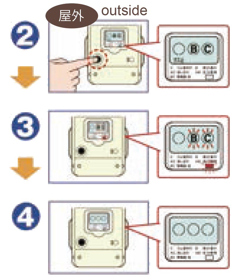 ※点滅中にガス(お湯やコンロ)を使用されますと、安全装置が働き再度遮断されます。その場合は、恐れ入りますが最初の手順からやり直してください。 - 赤ランプと液晶の「ABC」表示が消えましたら、復帰完了です。通常通りガスをご利用いただけます。